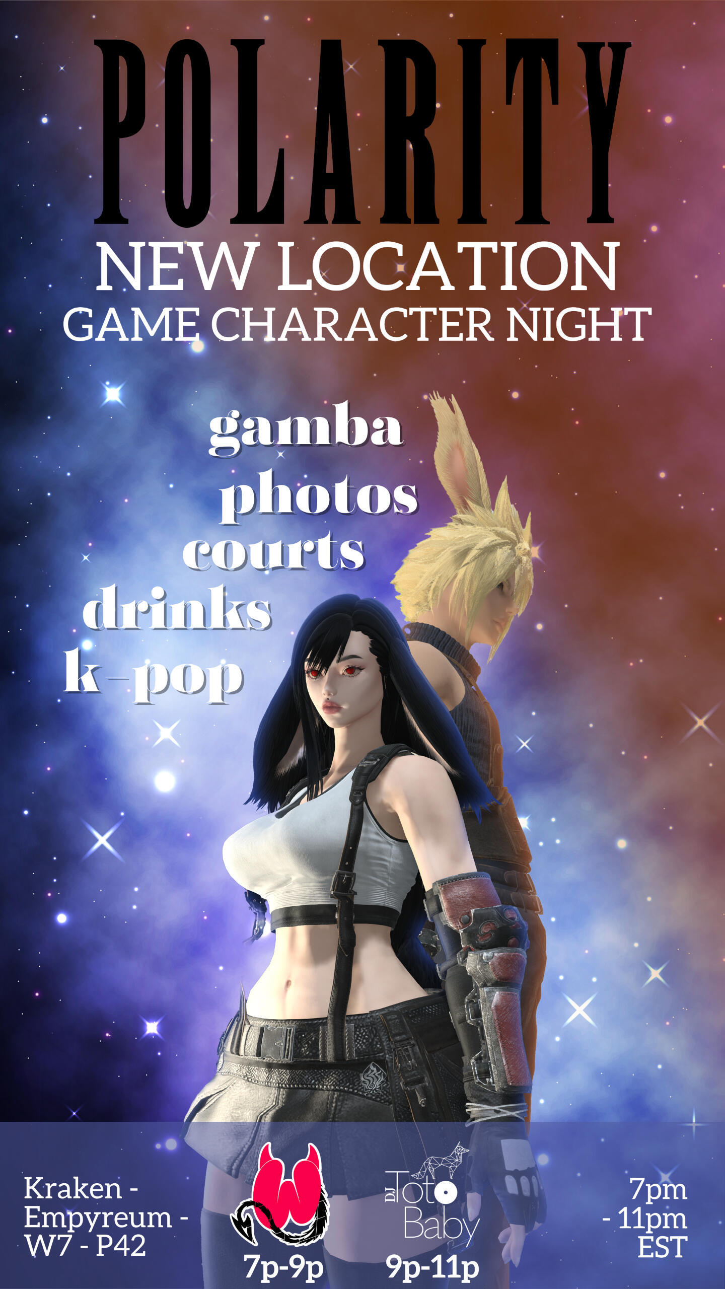 Welcome to Polarity, a place where contrast creates chemistry and every evening is designed to spark connection.Polarity is a celebration where contrasts collide and create something electric. Light and shadow. Elegance and edge. High-energy and heartfelt. Though we may seem like opposites, we’re united by a shared vision, deep passion, and a purpose to move you body and soul.Brought to life by Haz and Elysia Veil, Polarity is more than a venue. It’s a living rhythm: a sanctuary for dreamers, dancers, and those who live for the in-between. Here, K-pop precision meets J-pop flair, blending iconic choreography, futuristic visuals, and infectious hooks into a sonic and visual escape like no other.Every night is a curated experience, where shimmering pop anthems mix with underground remixes and bass-heavy beats. Whether you’re front and center, dancing under neon lights, or tucked away in a velvet booth vibing with your crew, the energy finds you.This isn’t just a party. It’s a pulse. A vibe. A world of its own. Welcome to Polarity.